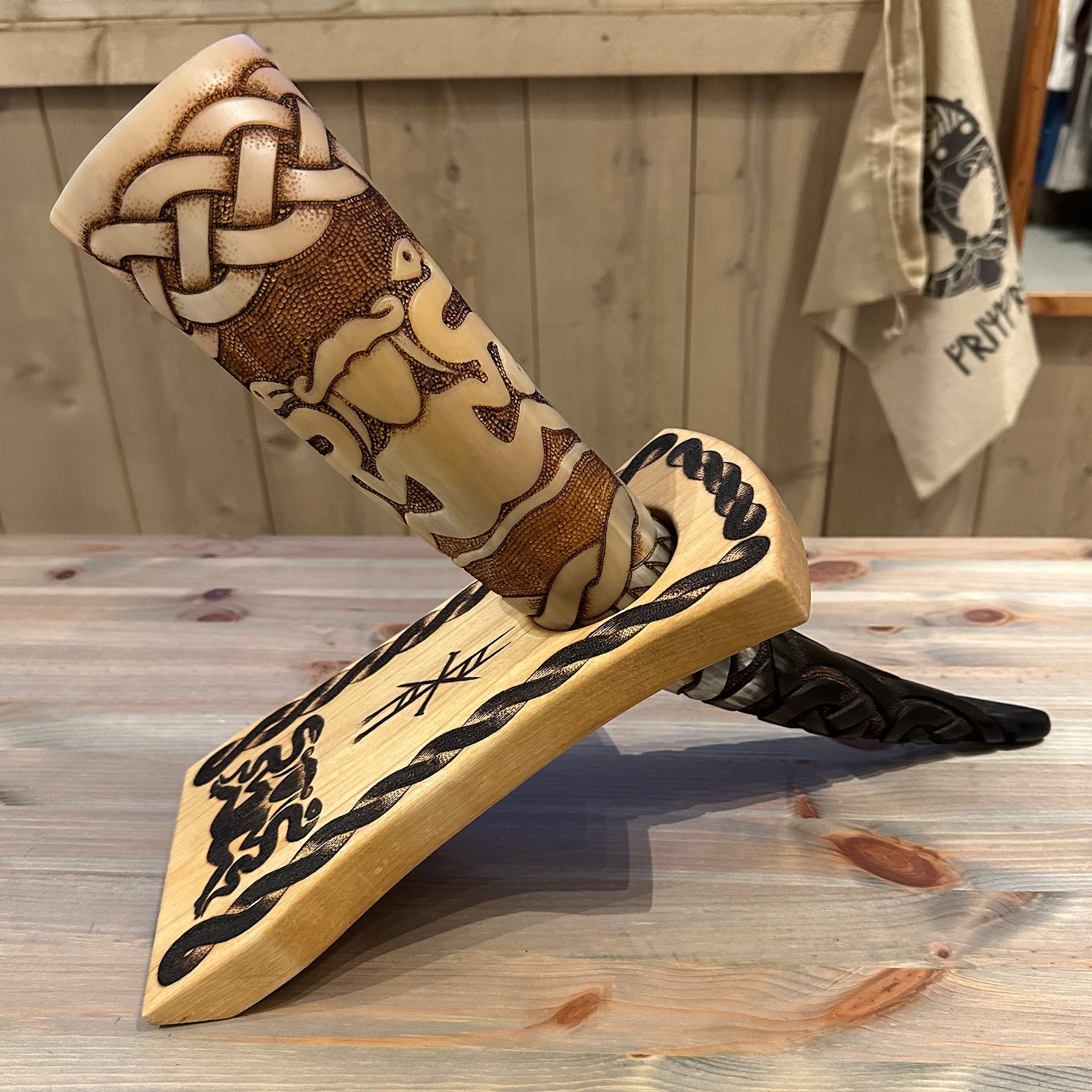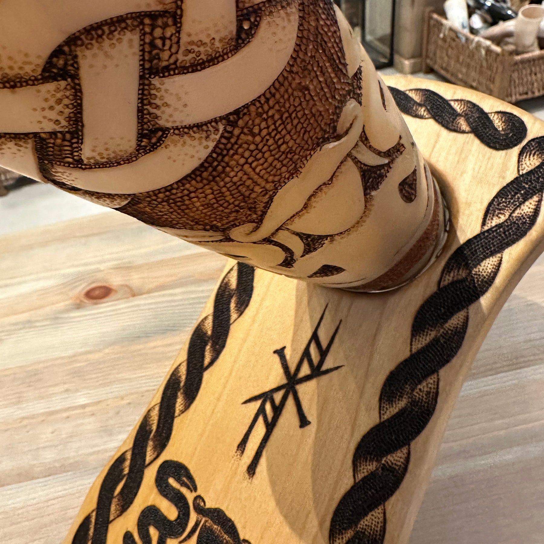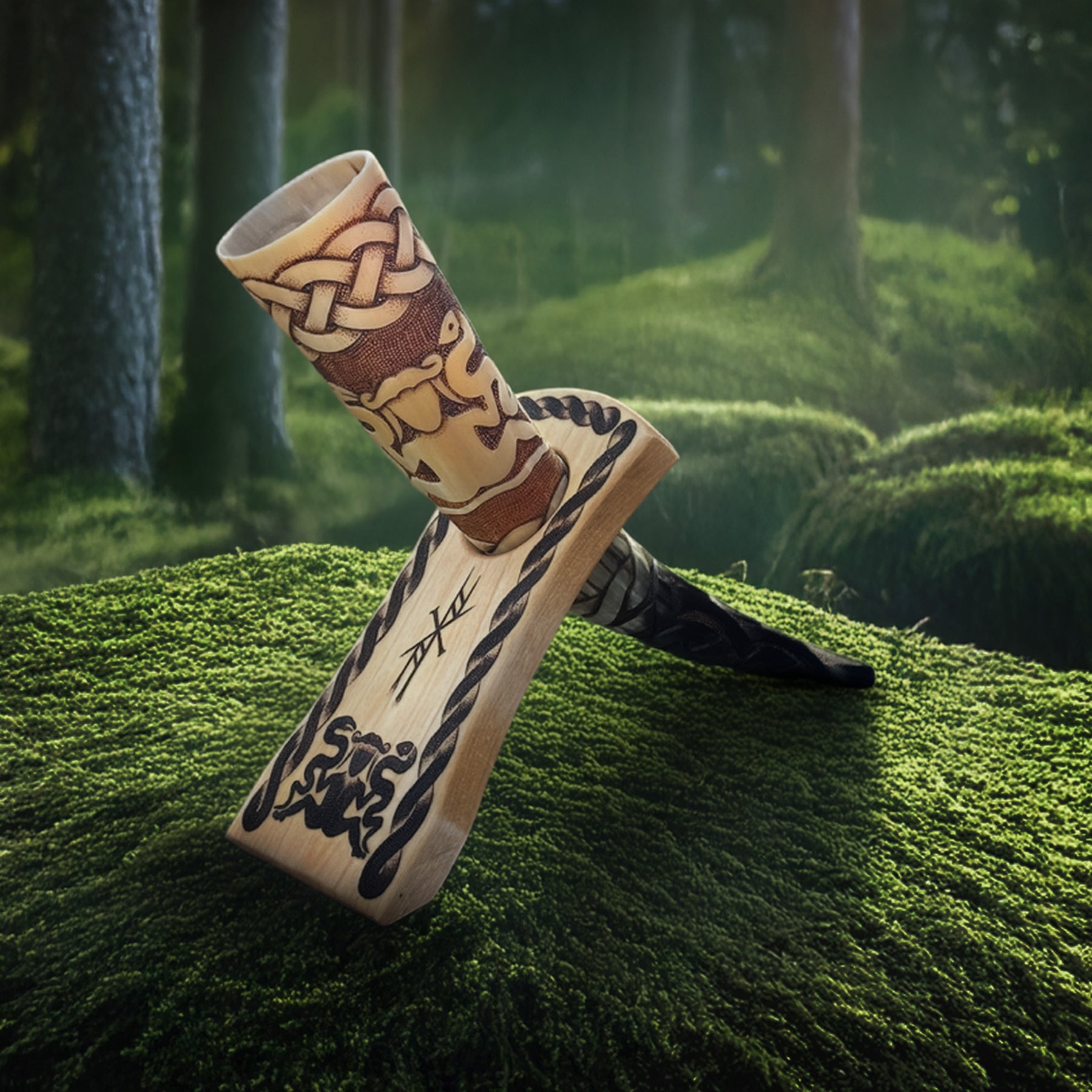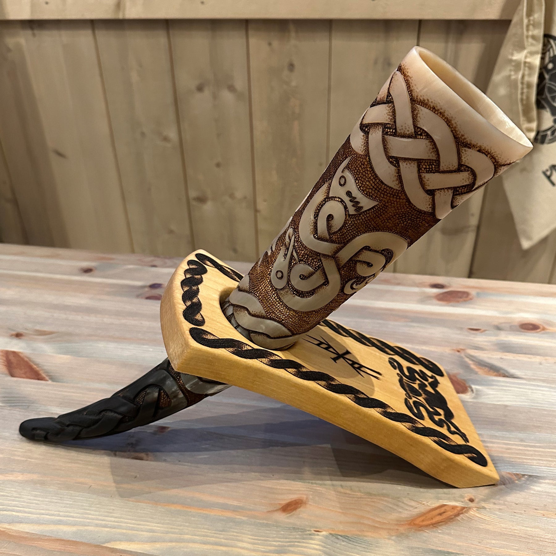 In dieses sehr detailreiche Horn mit einem Fassungsvermögen von 2 Pints wurde viel Arbeit investiert. Es ist vom Bildstein auf Gotland in Schweden inspiriert, der das ursprüngliche Design aufweist. Die Interpretation des Künstlers weicht leicht von der gängigsten Interpretation ab. Er sieht sie als die „erste Hexe“, daher die Runenschrift „wurmawikko-hagatusi“ im älteren Futhark. Das Knotenmuster entspricht dem Stil der 600er Jahre und dem Stil des Bildsteins. Die Tiere im dreieckigen Triskele wurden durch einen Wolf, einen Raben und eine Schlange ersetzt, was besser zur Interpretation des Motivs durch den Künstler passt.