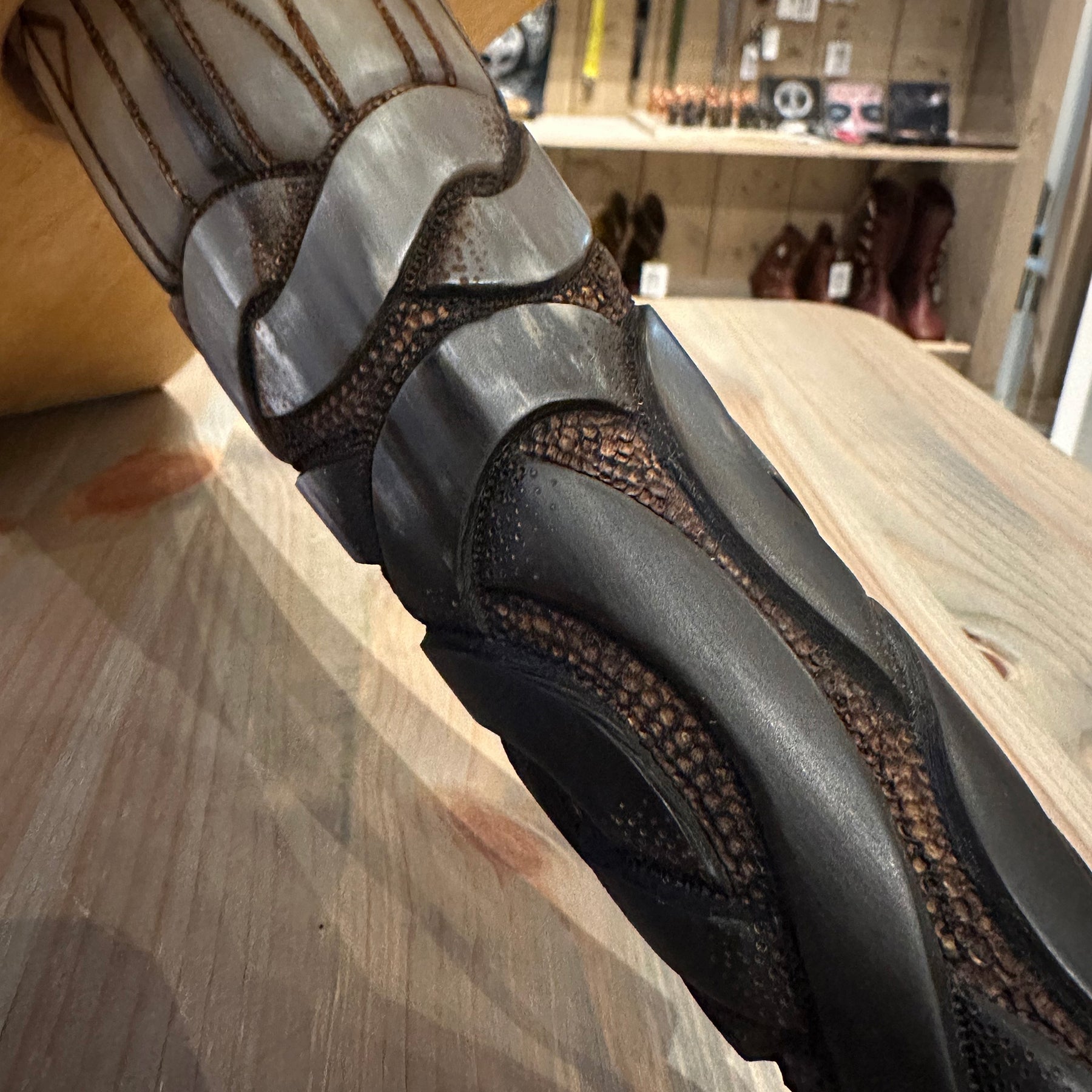 Die zeitaufwendige Herstellung unserer Premium-Hörner erfordert eine Kombination aus hoher Kunstfertigkeit und fachmännischem Handwerk. Jedes individuelle Motiv wird für den jeweiligen Zweck entworfen und von Hand in das Horn geschnitzt. Der handgefertigte Holzständer entspricht in Qualität und Handwerkskunst dem Horn. Jedes Horn ist ein einzigartiges Kunstwerk, das Authentizität und Qualität verspricht.