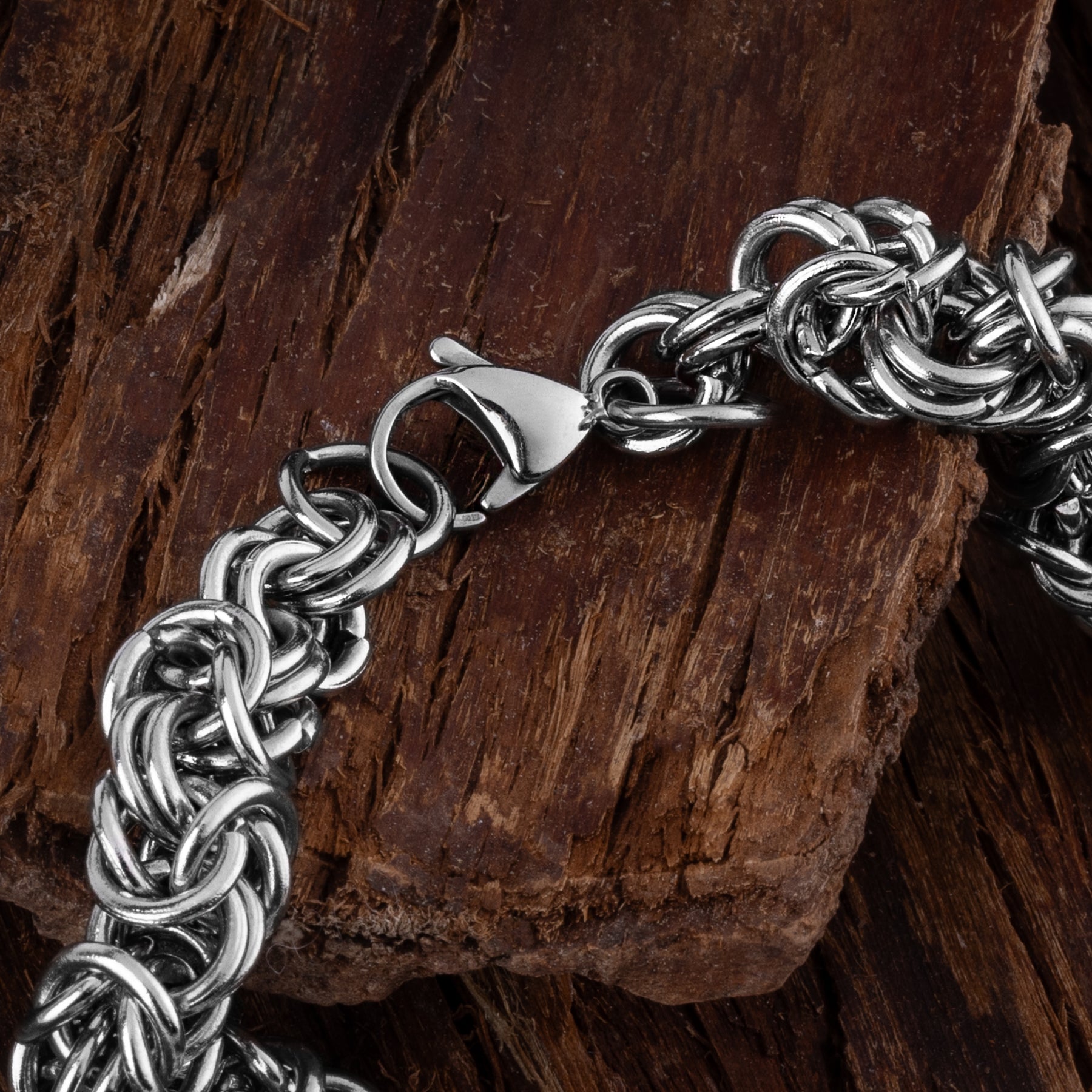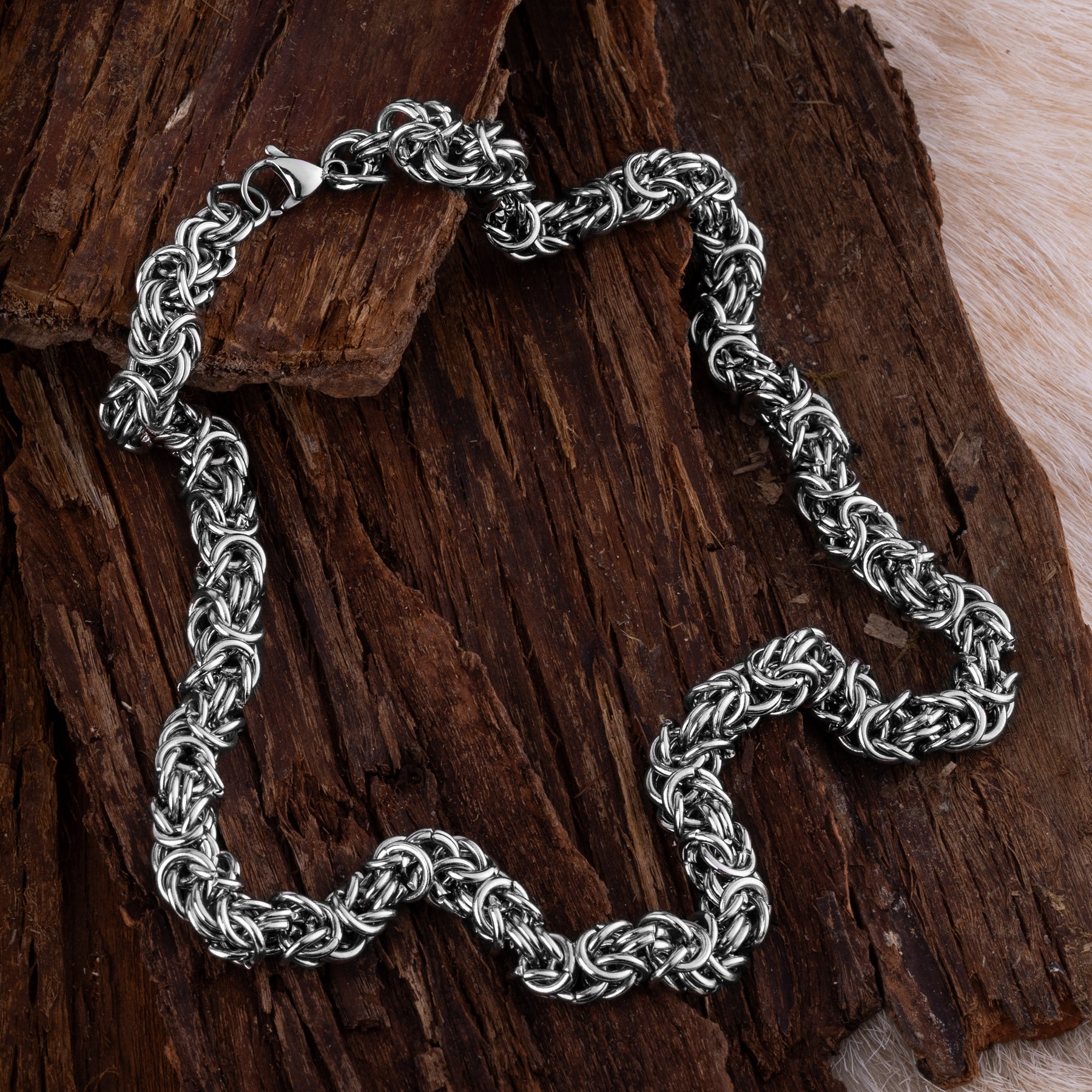 Wie der Name schon sagt, ist dies der König aller Ketten und galt bei den Wikingern als Zeichen von Erfolg und Macht. Unsere King CHain ist zu 100% aus Edelstahl handgefertigt, was zu einem fantastischen Schmuckstück führt, das niemals rosten wird. Die Herstellung von Hand ist sehr zeitaufwändig, da jedes kleine Glied einzeln in die Kette eingefügt wird. Die Kette wird mit einem Karabinerverschluss geliefert, der dieses massive Schmuckstück sicher um Ihren Hals hält.