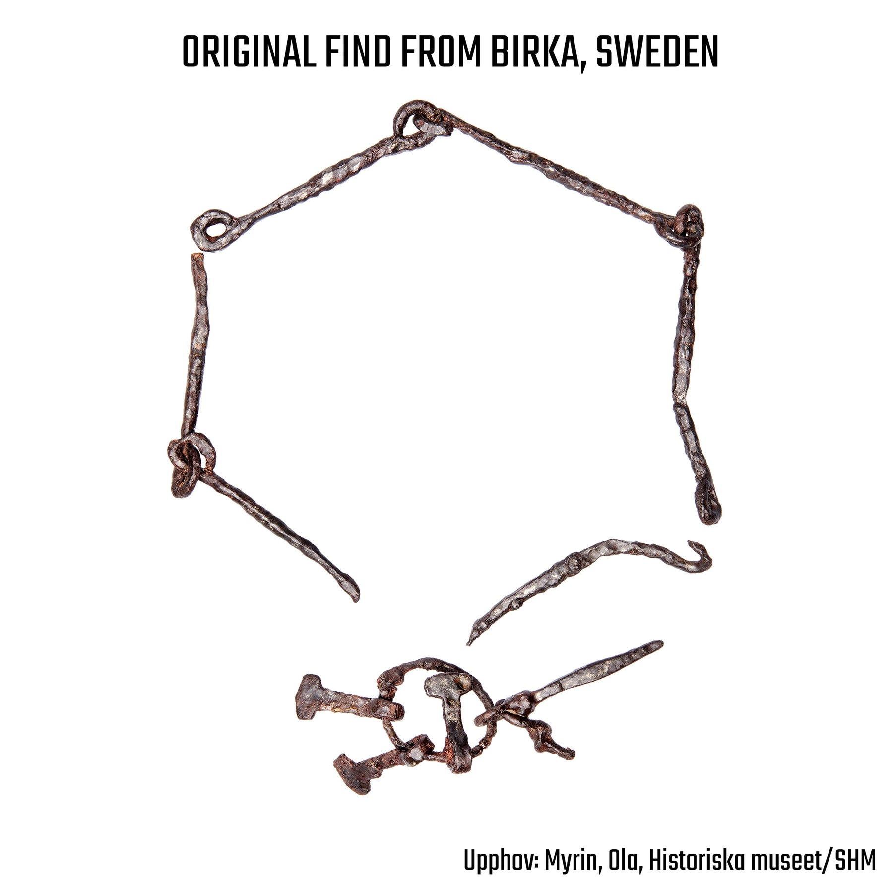 Die Maße des Originalfundes wurden beibehalten, aber wir haben der Kette zwei zusätzliche Glieder hinzugefügt - insgesamt sind es jetzt 9 statt der ursprünglichen 7 -, wodurch sie leichter über den Kopf gezogen werden kann. Die zusätzlichen Glieder können leicht entfernt werden, um eine exakte Kopie des Originalfundes zu erhalten.