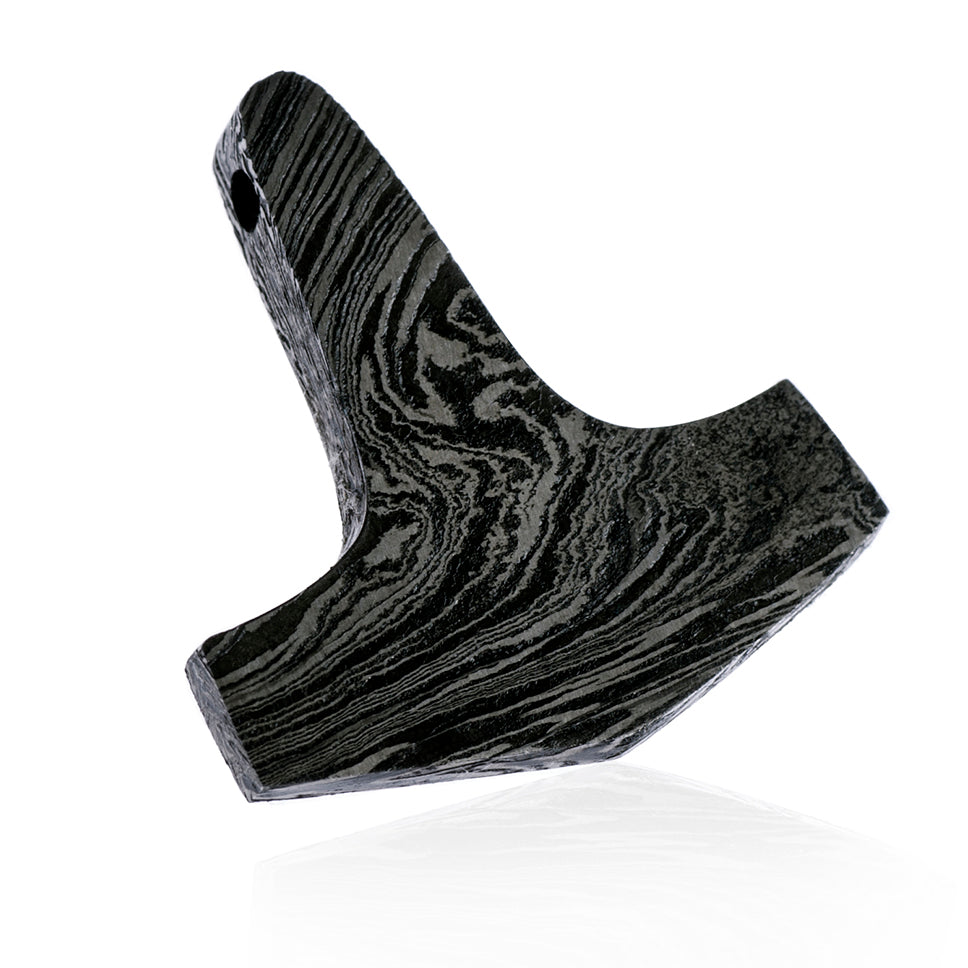 Ein handgeschmiedeter Thorshammer aus Damaszenerstahl. Damaszenerstahl wird durch eine fortschrittliche Schmiedetechnik hergestellt, bei der verschiedene Eisen- und Stahlschichten miteinander verschweißt werden. Diese Technik wurde bei vielen Wikingerschwertern verwendet.