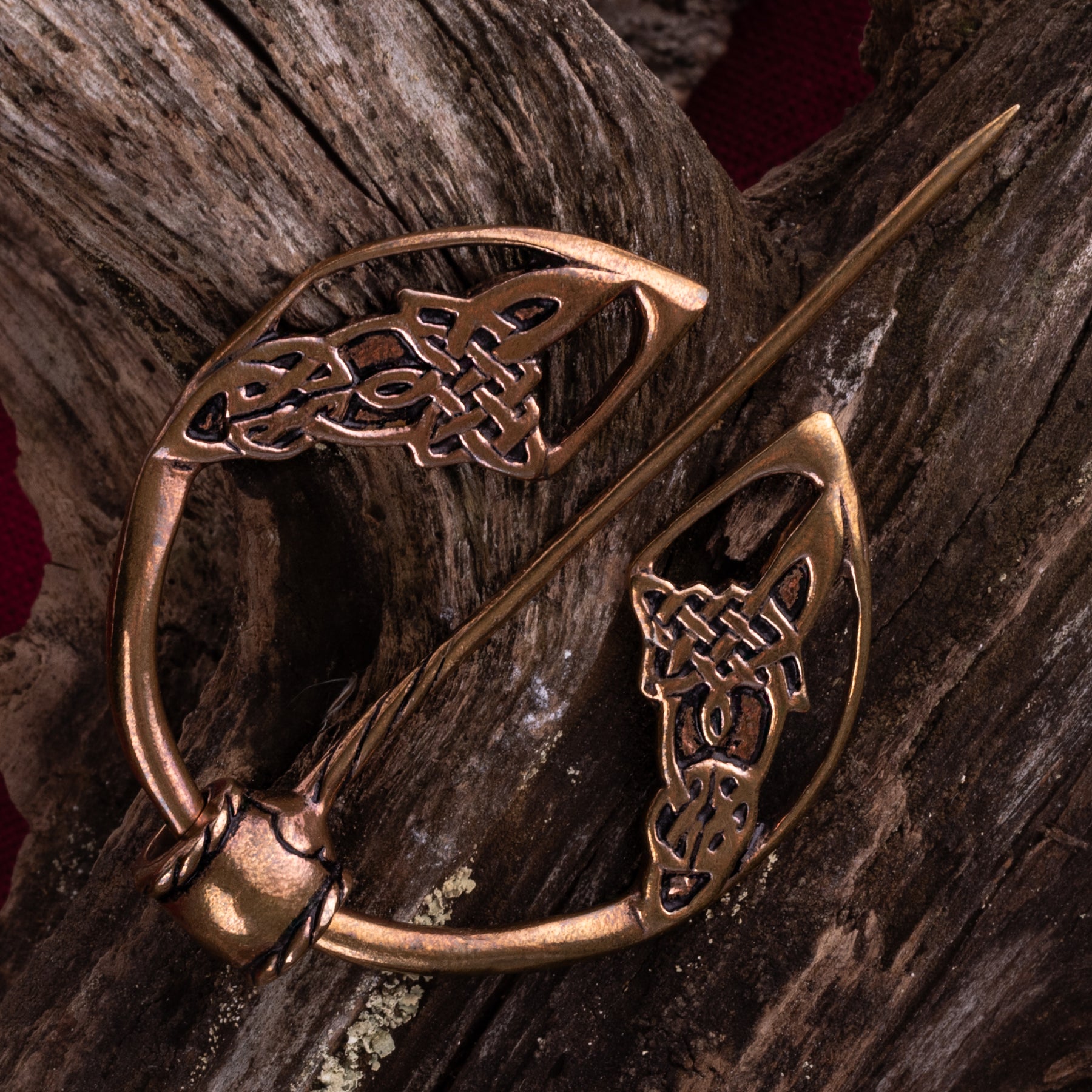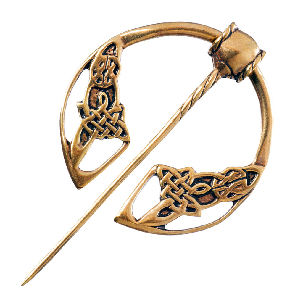 Eine detaillierte, hochwertige Fibel mit einem Knotenmuster, das von Artefakten der Wikingerzeit inspiriert ist. Diese großen Broschen wurden verwendet, um Mäntel, Pelze, und andere schwere Kleidungsstücke zu befestigen.