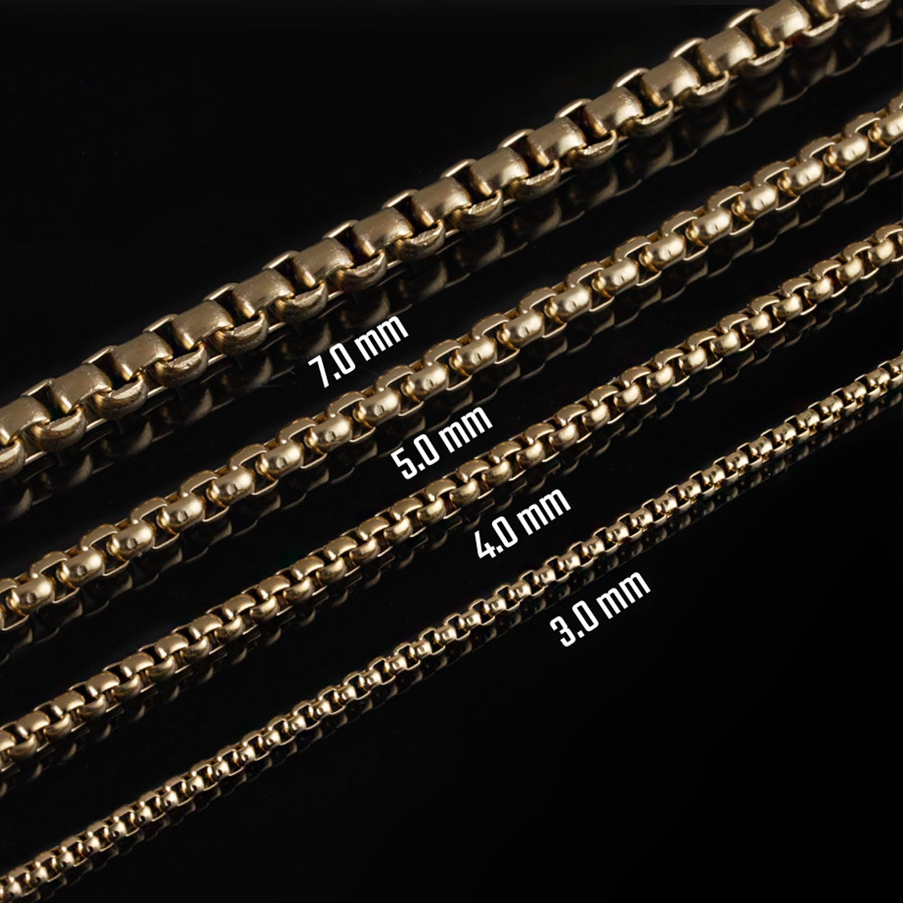 Round box chain square link design. Worn as a solitaire or with a pendant.