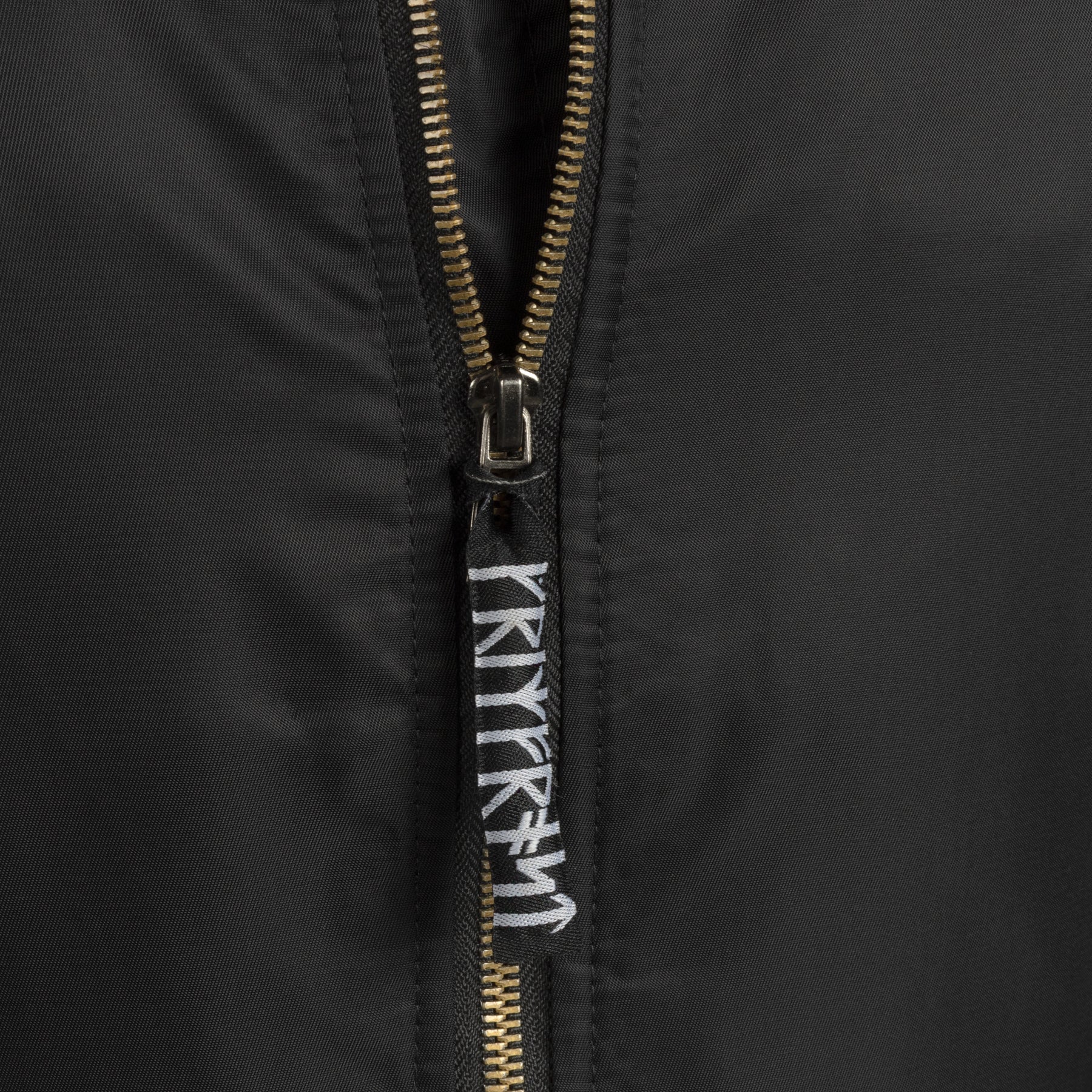 Classic bomber jacket crafted from 100% polyester for durable, all-weather performance. Its timeless silhouette combines urban style with practical functionality, ideal for everyday wear or layering in cooler conditions. Custom made for Grimfrost with runic tags and labels.