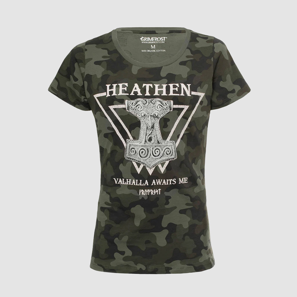 The shirt printed with "Heathen, Valhalla Awaits Me", a Valknut triple-triangle and Mjölnir, the hammer of Thor. The Valknut triple-triangle is the symbol of Odin, king of Viking gods. Mjölnir is a powerful symbol of Thor, the Viking god of thunder. The design is based on an archaeological find of a Thor's Hammer made in Skåne, Sweden.
