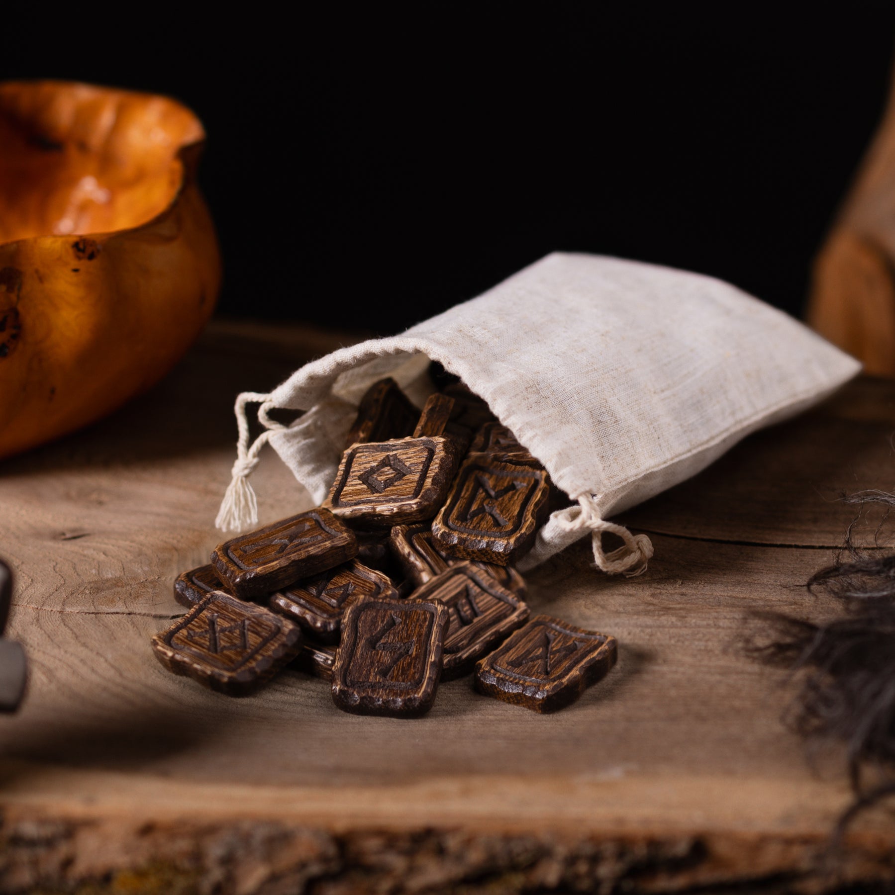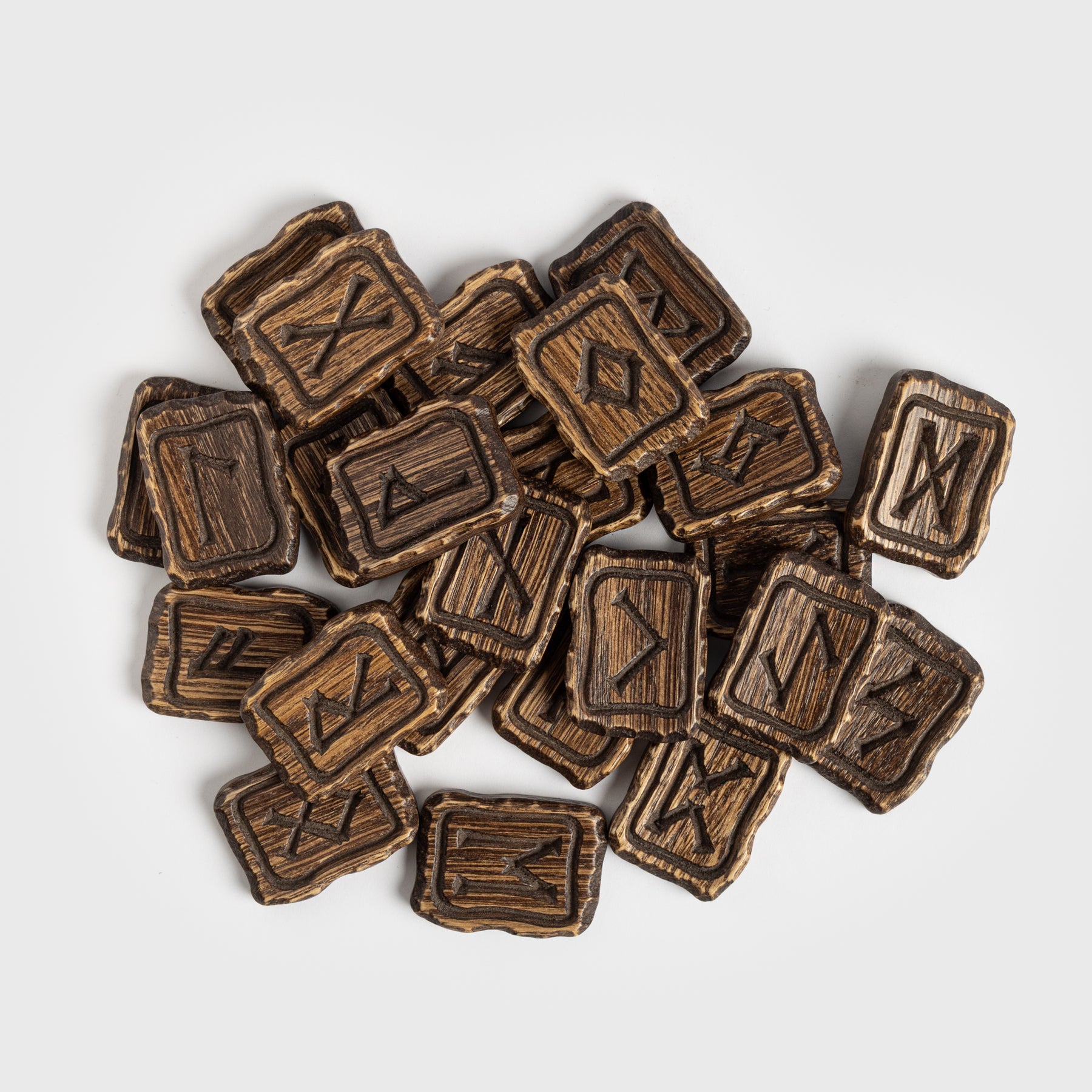 A masterfully crafted set of oak tiles, each engraved with a rune from the Elder Futhark. Perfect for games, divination, or as a striking decorative piece.