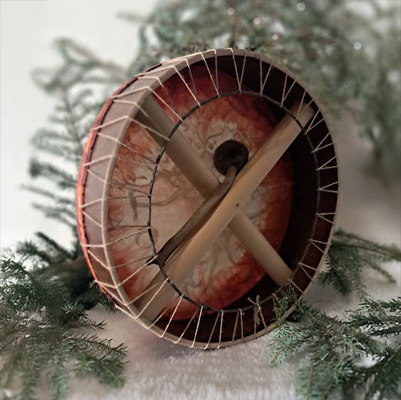 Traditional shaman drum that is carefully handmade in Finland, where old Nordic shamanic traditions have survived throughout the centuries. It has been crafted out of traditional materials without the use of any power tools. Only a handsaw, a knife and sandpaper has been used during the process. This crafting method takes time, but it is necessary if the drum is to have a spirit of its own.