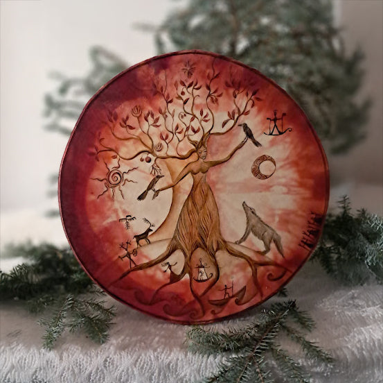 Yggdrasil in the shape of Mother Earth is beautifully painted by hand onto the drum skin. Within it and along its branches are symbols representing gods, mortals and creatures.