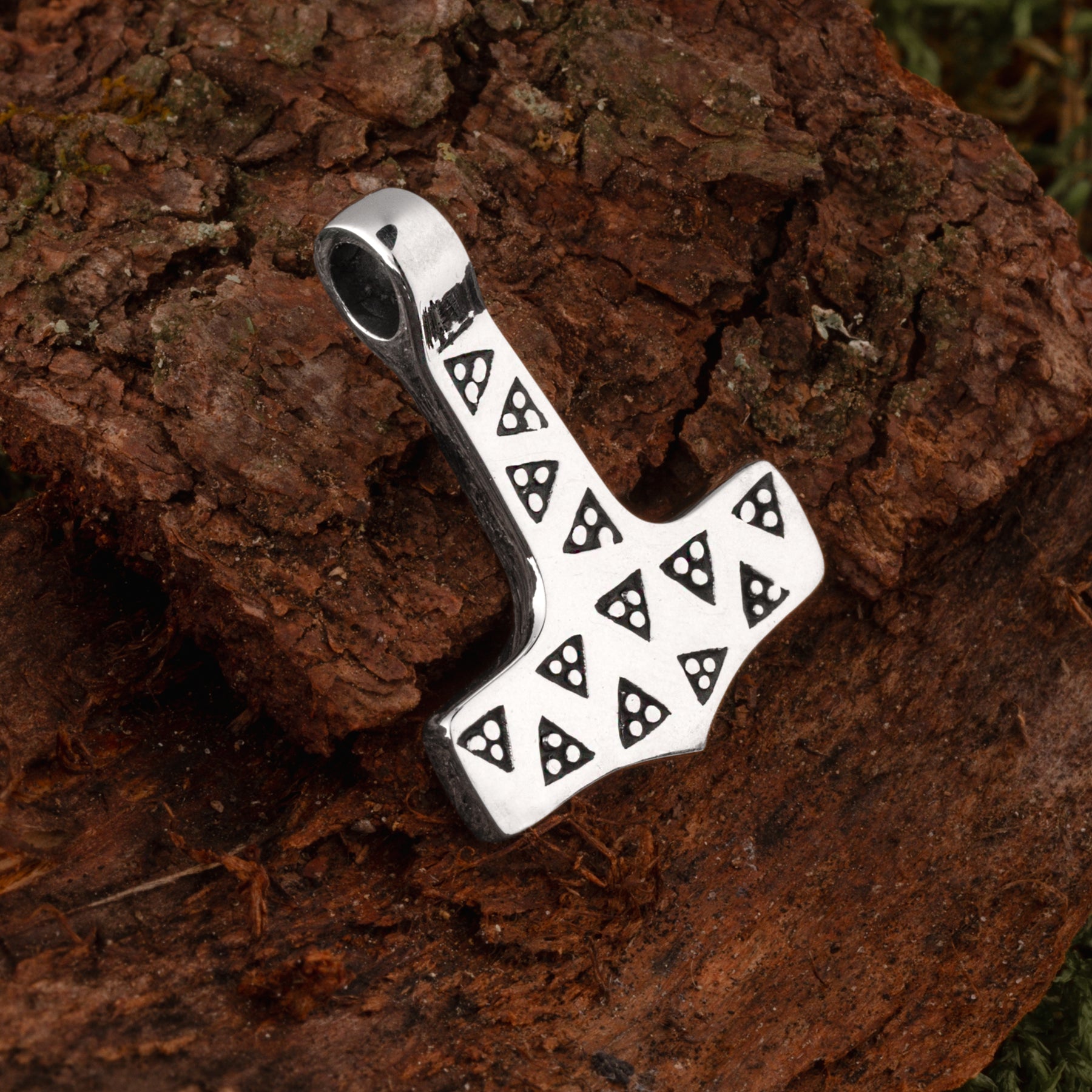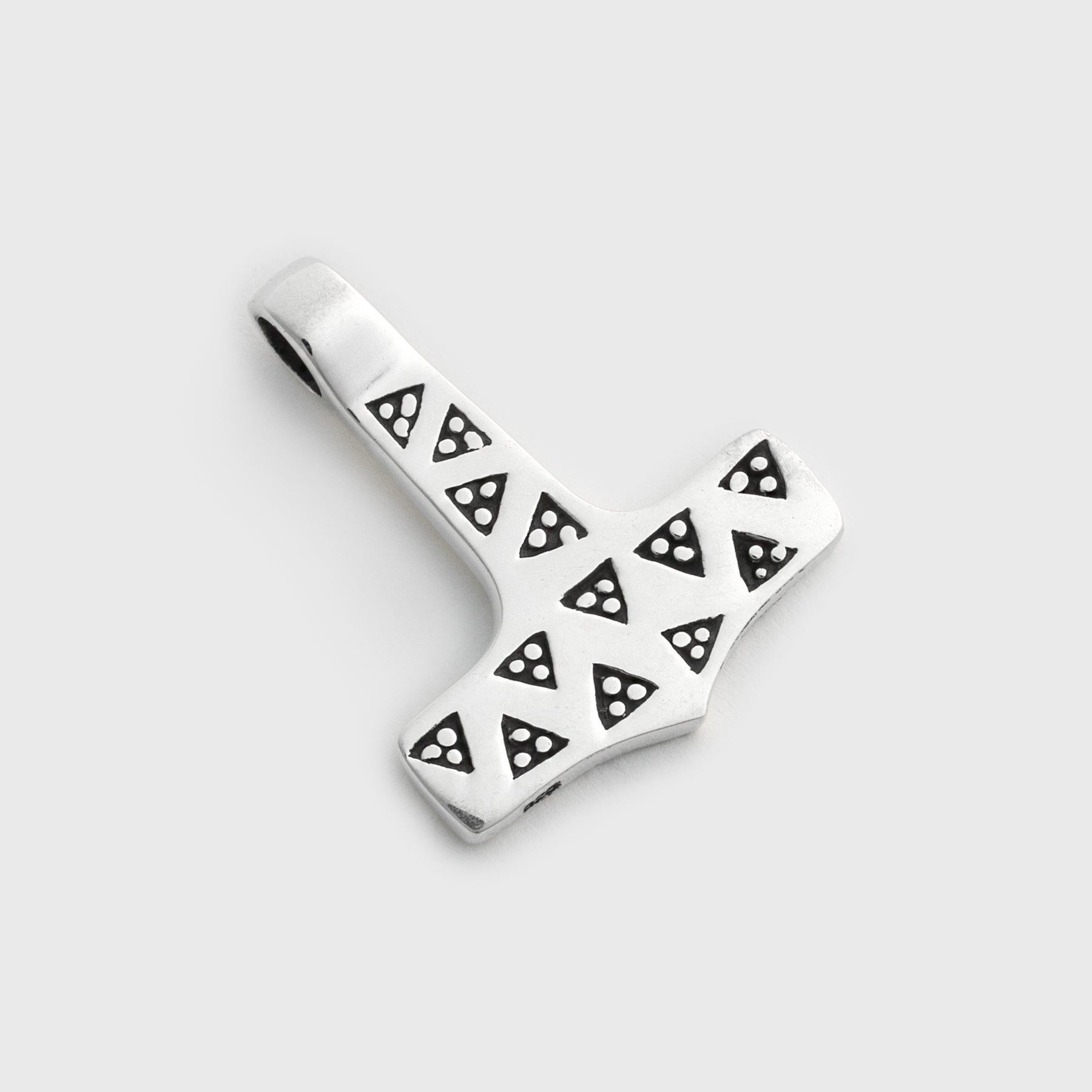 A reproduction of the Thor’s Hammer found in 1828 in the Moheda parish, in Småland, Sweden. The hammer was part of a larger treasure that was placed in a clay urn and buried. The original find is today located at the Småland County Museum in Växjö, Sweden. The original hammer was found with a ring. Stamping triangles was a common way of decorating jewelry during the Viking Age.