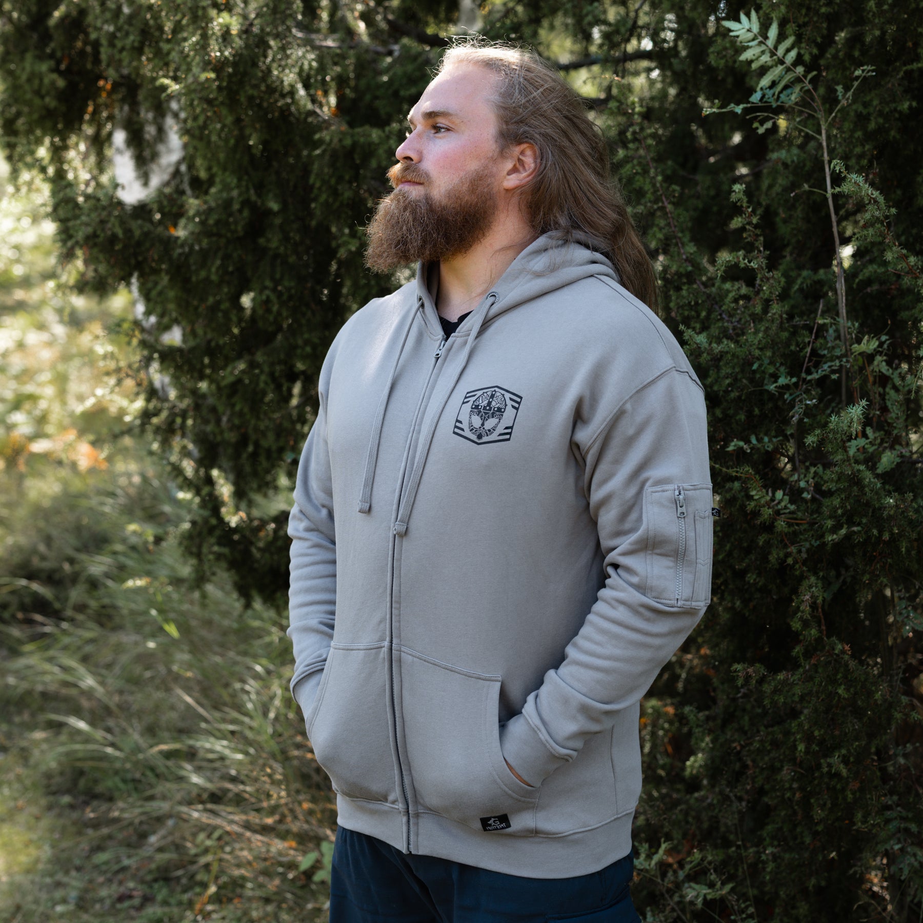 Meet your new favorite hoodie. This premium full zip hoodie is custom-made for Grimfrost in soft, luxurious organic cotton. Even the dyeing and printing processes are fully organic, which is good for both you and Mother Earth. The hoodie comes with a zipped utility pocket on the left arm and spacious kangaroo pouch pockets. To top things off, we have given the drawstring eyelets a Younger Futhark runic circle.
