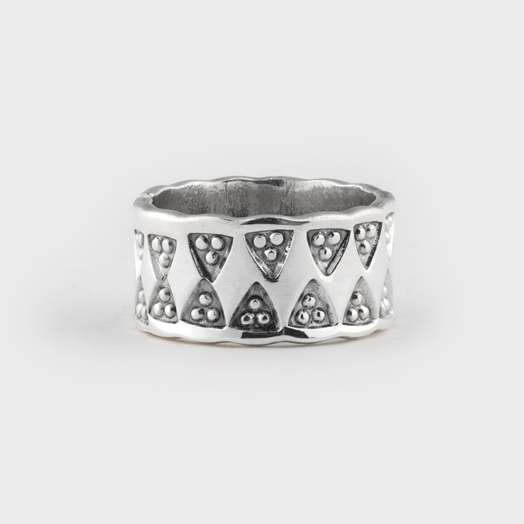 The practice of decorating silver jewelry with stamps was very prevalent practice during the Viking Age. The most common shape was a triangle with one or three pellets. Applying stamps requires a steady hand since the punch has to be made in a single blow.