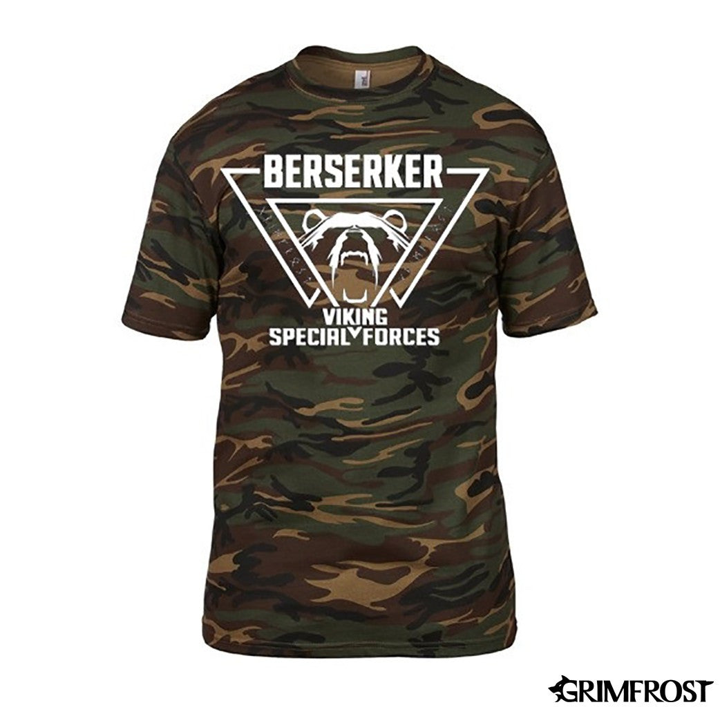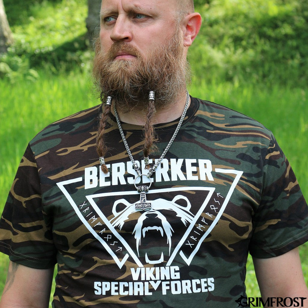 Top-quality t-shirt handprinted in Sweden with: "Berserker, Viking Special Forces", a Valknut triple-triangle and a roaring bear. The Valknut is a symbol of Odin, the god of the Berserker. The bear represents the state of mind of the raging Berserker. Production and copyrighted design by Grimfrost.
