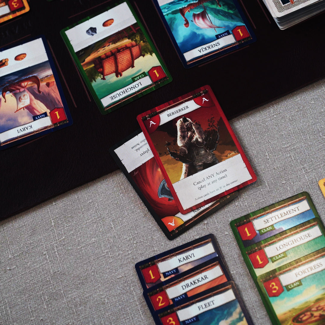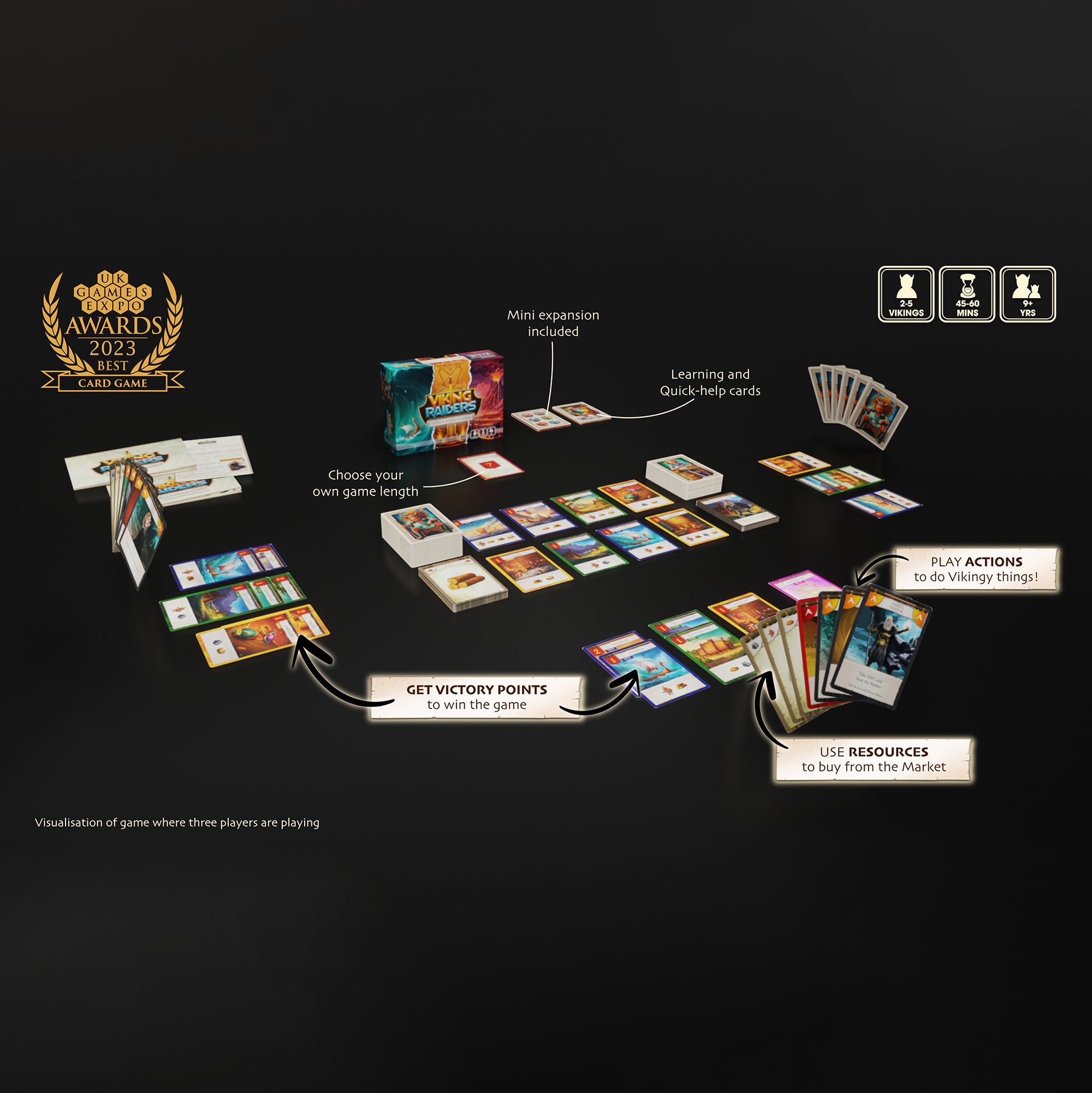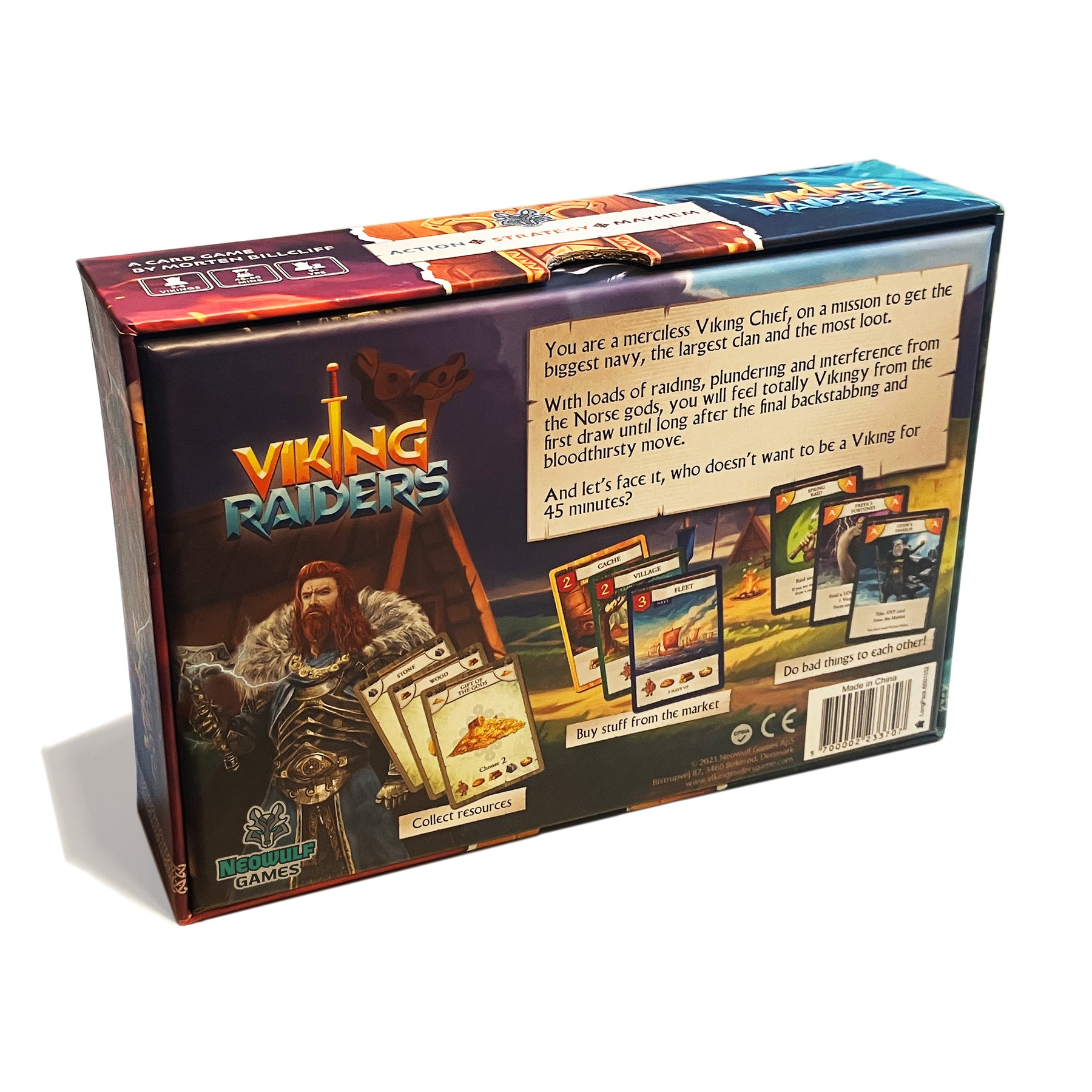 Viking Raiders is a quick, fun and easy-to-learn card game for 2-5 players (age 9+) brimming with action, strategy and mayhem. Become a Viking for 45-60 minutes and jostle with your friends and family to become the ultimate Viking Chief with the largest Navy, the biggest Clan, and the most Loot!