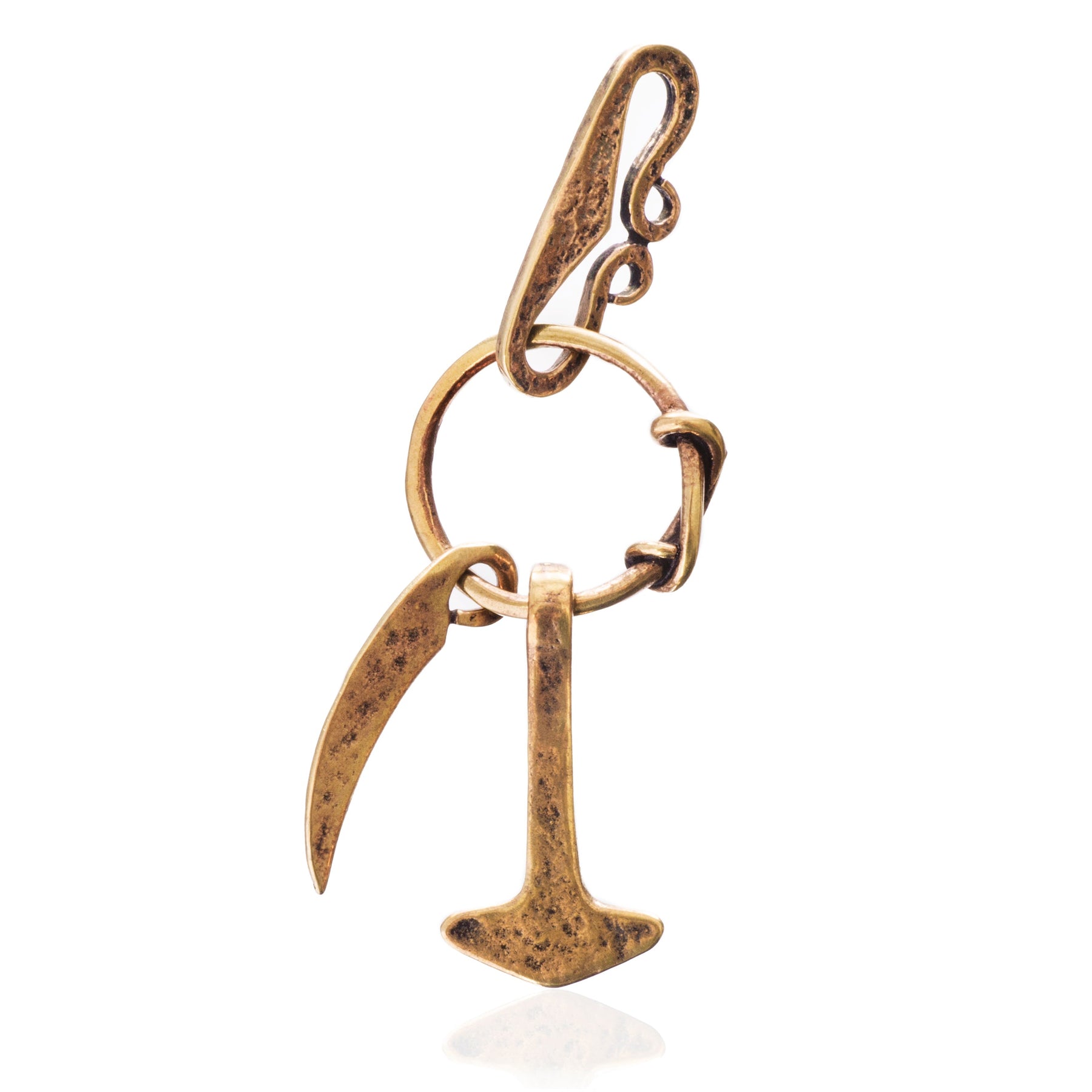 Amulettringe waren in Skandinavien vor und während der Wikingerzeit wichtig. Sie bestanden aus einem Ring, in den verschiedene Amulette und Anhänger gehängt wurden. Die Amulette hatten unterschiedliche Formen, die von Sicheln und Feuerstäben bis hin zu Ringen, Äxten und Thorshämmern reichten. Amulettringe wurden sowohl in wikingerzeitlichen Gräbern als auch in ausgegrabenen Wohnräumen gefunden. Unser Amulettring wird mit der häufig vorkommenden Sichel, dem Feuerstahl und dem Thorshammer geliefert.