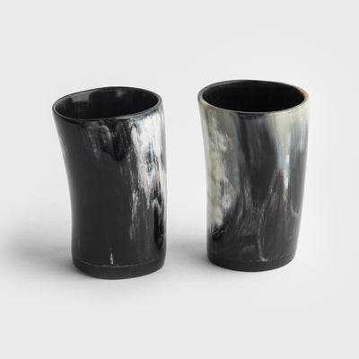 Ein Paar Schnapsgläser, die in sorgfältiger Handarbeit aus einem einzigen Stück Horn gefertigt wurden und für zusätzliche Stabilität mit einem Harzsockel versehen sind. Die Gläser werden sorgfältig poliert, gereinigt und mit einer versiegelten Innenseite geliefert, aus der man sicher trinken kann. Form und Farbe jedes Glases sind einzigartig und können von denen auf dem Bild abweichen.