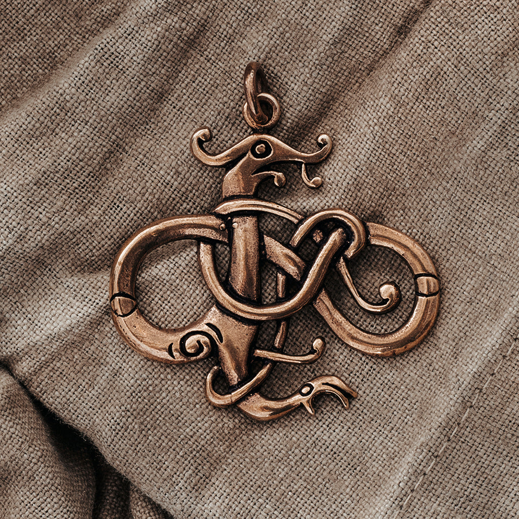 Ein fein gearbeiteter Bronze-Anhänger, der einen Lindwurm darstellt.