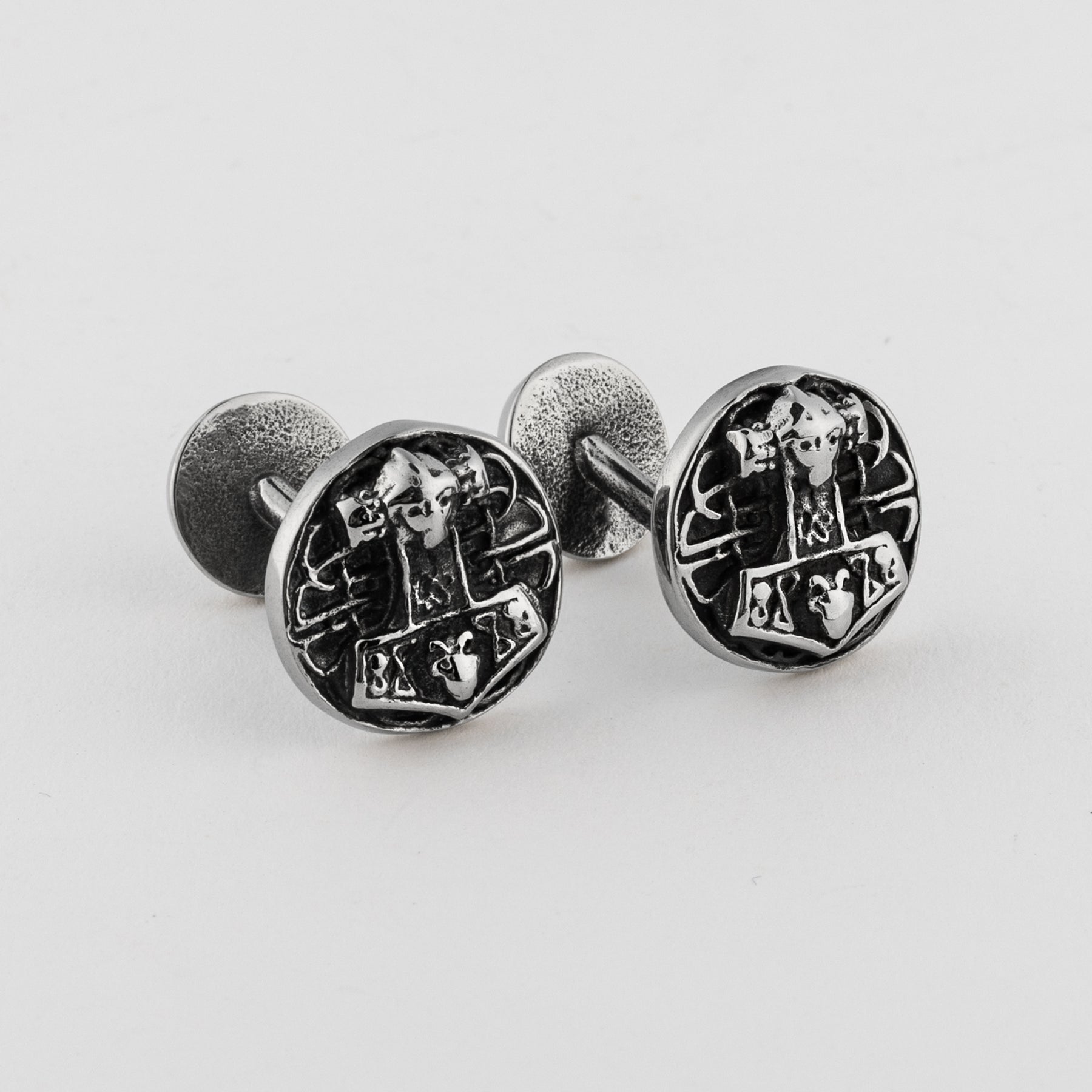 Ein Paar Manschettenknöpfe mit Mjölnir-Motiv. Kombiniere sie mit der Mjölnir Platte Krawattenspange.