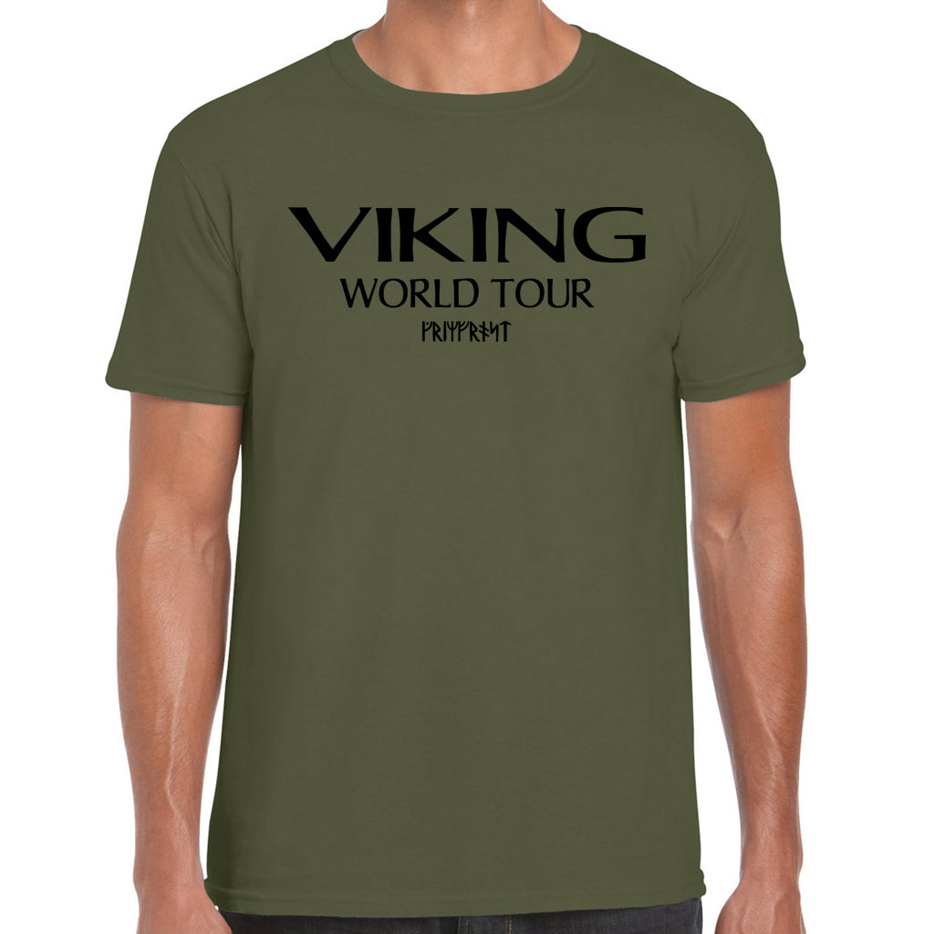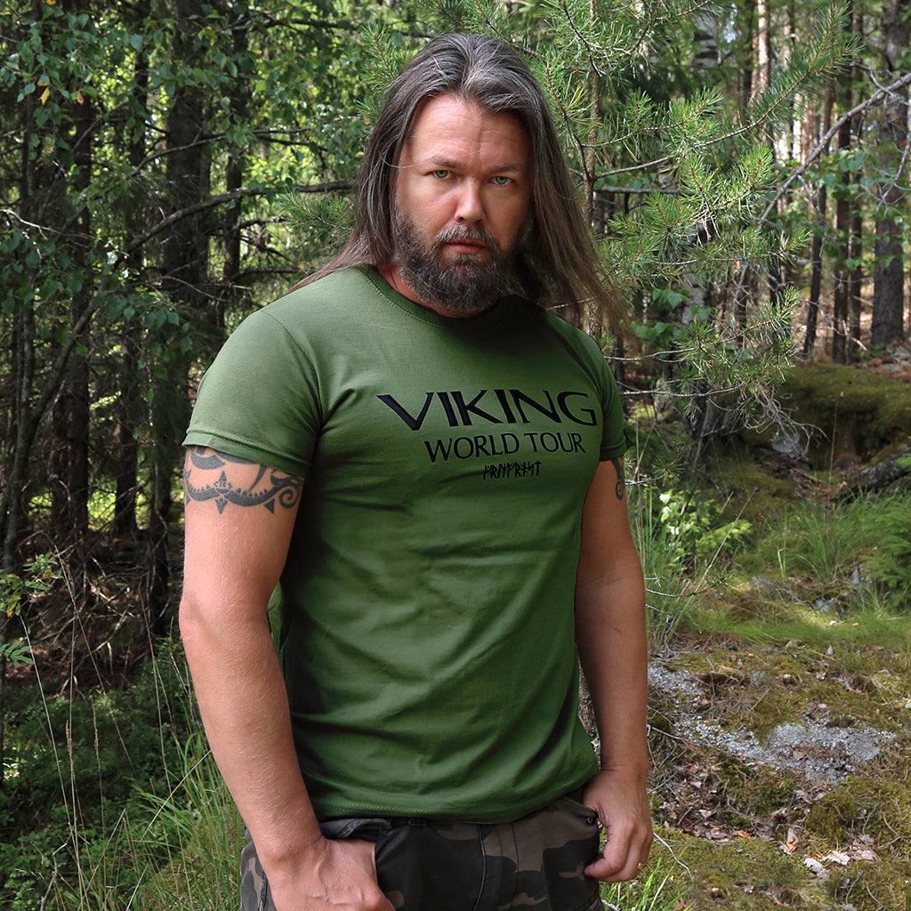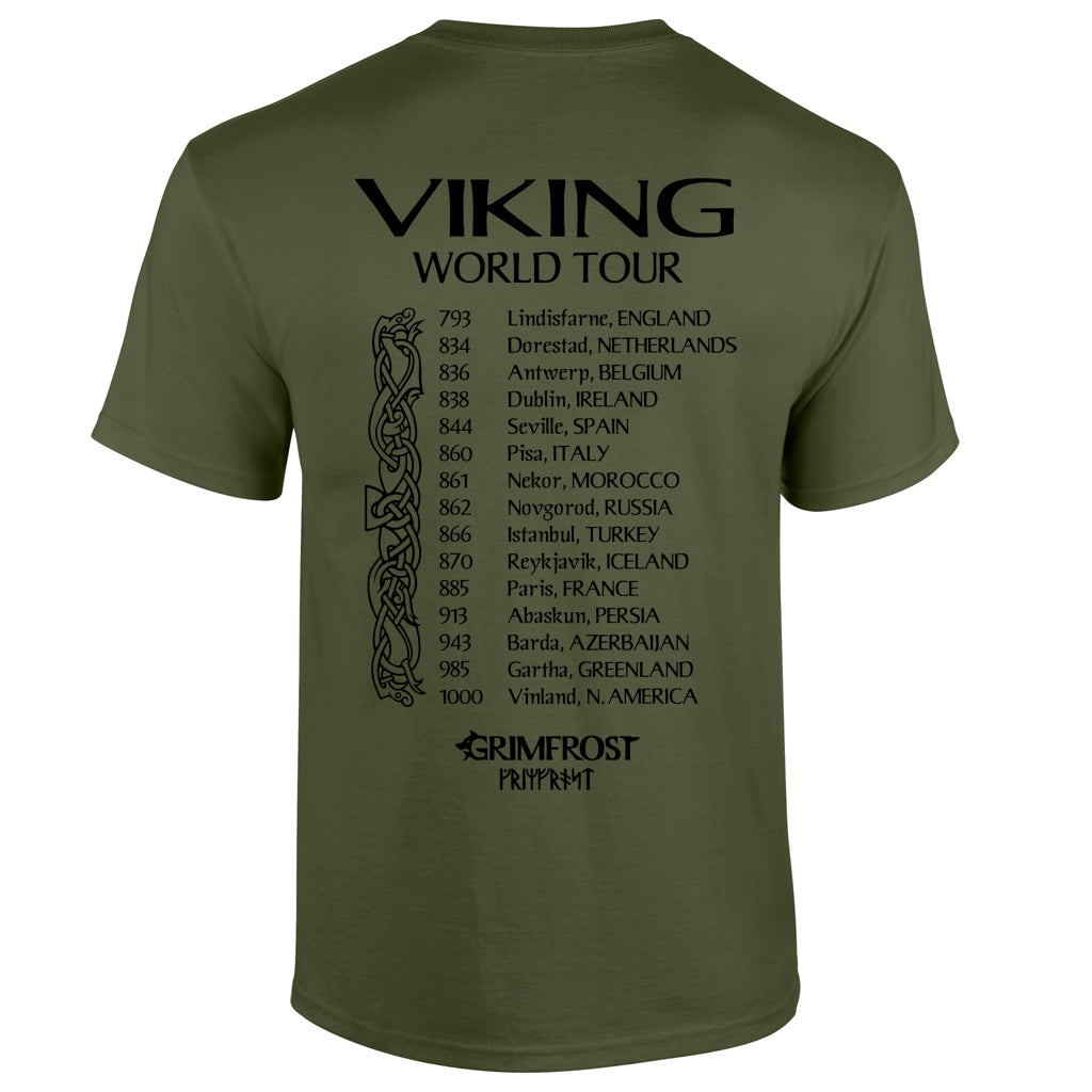 Softstyle T-Shirt, das auf der Straße genauso gut funktioniert wie im Fitnessstudio. Es ist in Schweden handbedruckt mit: "Viking World Tour" auf der Vorderseite und den Jahren und Orten einiger Wikingerexpeditionen und -überfälle auf der Rückseite.