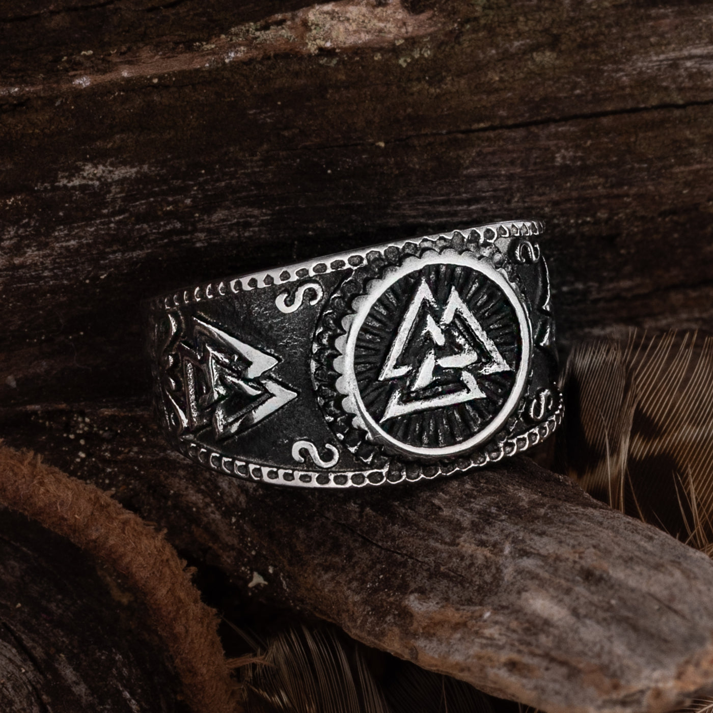 Ein modernes Design, inspiriert von authentischen Wikinger-Artefakten. Er ist aus Edelstahl gefertigt, zeigt das Valknut-Symbol und ist in den Größen #8 bis #15 erhältlich.
