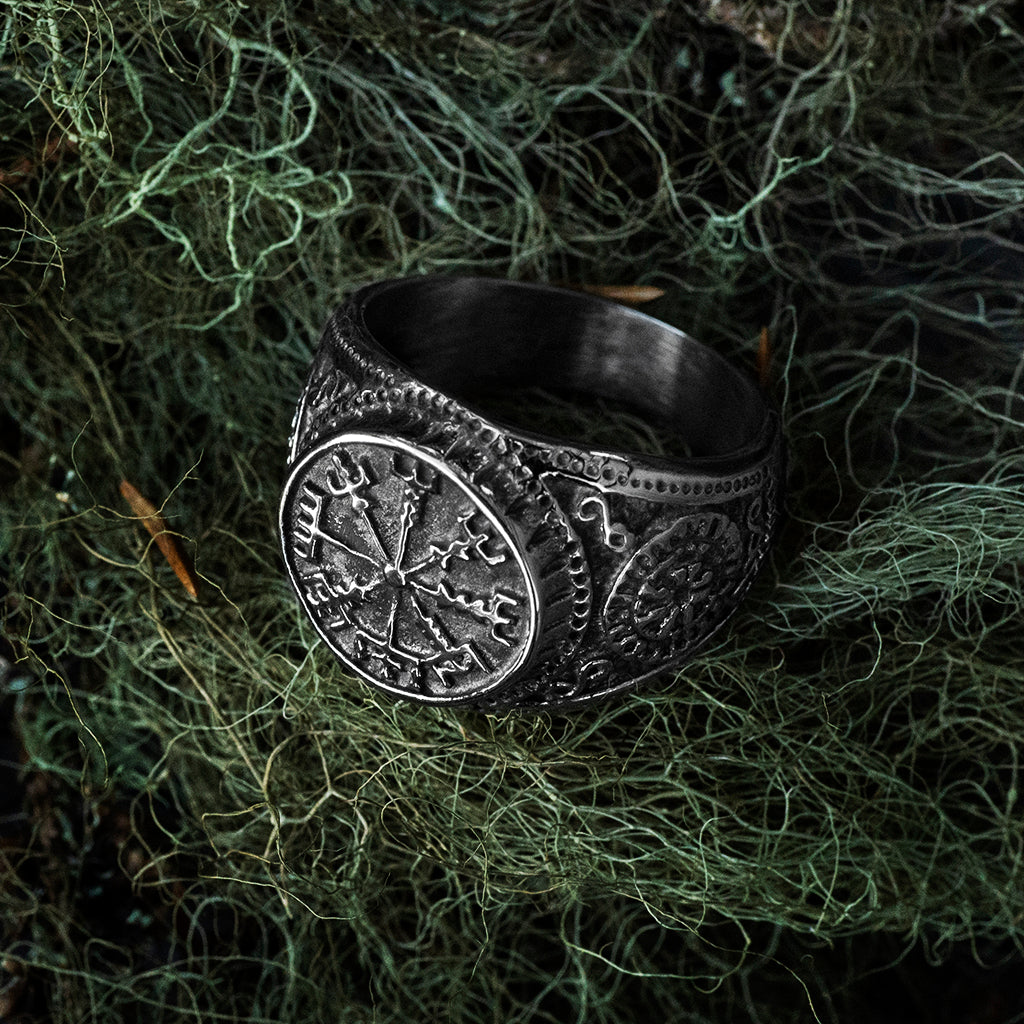 Ein modernes Design, inspiriert von authentischen Wikinger-Artefakten. Er ist aus Edelstahl gefertigt, zeigt das Vegvisir-Symbol und ist in den Größen #8 bis #15 erhältlich.