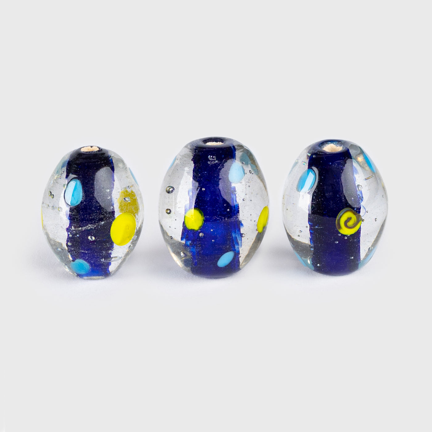 Drei Wikinger-Glasperlen. Sie wurden traditionell durch Aufwickeln von Schichten aus geschmolzenem Glas auf einen Metallstab hergestellt. Glasperlen wurden sowohl von Männern als auch von Frauen häufig für Halsketten verwendet. Frauen trugen sie auch zwischen Schalenfibeln hängend.